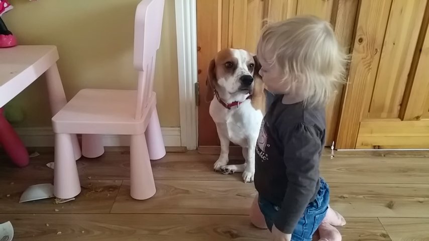 Вот и пёсик по имени Рокки решила немножко пошалить, она разбила тарелочку маленькой девчонки.