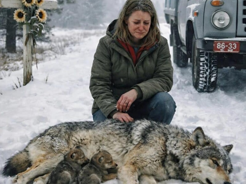 Hun steg ud af bilen, og da hun kom tættere på, fandt hun en hunulv, der lå ubevægelig i sneen. Dyret var udmattet og var ved at fryse ihjel; ved siden af hende stod to små hvalpe og rystede af kulde og skræk, som om de bønfaldt deres mor om at rejse sig. Hendes logik sagde hende, at hun straks skulle gå tilbage til bilen; selv en såret ulv var altid farlig. Men hendes samvittighed vandt, og da hun bøjede sig ned for at hjælpe dyret, lagde hun mærke til en detalje, der tog vejret fra hende.