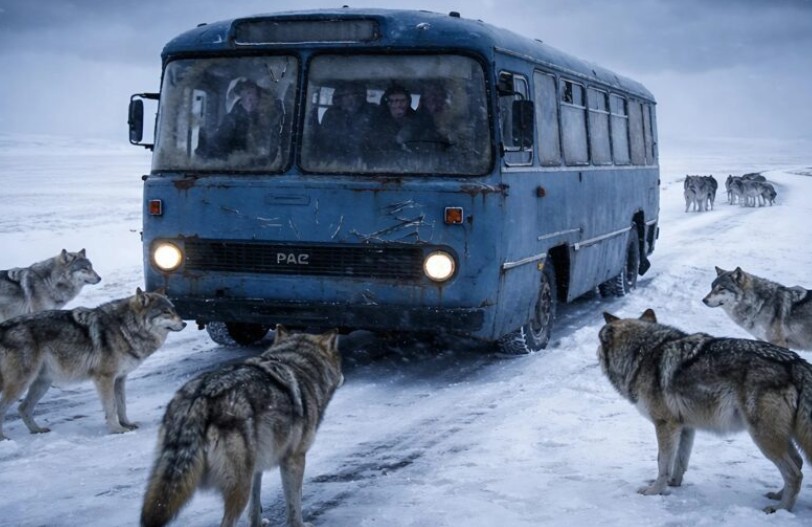 Dok je zimska oluja besnela punom snagom, autobus kojim je upravljao pedesetogodišnji iskusni vozač jedva se kretao po snežnom putu. Putnici su zabrinuto posmatrali belu tamu iza ledenih šara na prozorima, kada je vozilo iznenada počelo da usporava. Vozač je suzio oči, a ruke su mu čvršće stegle volan. Iz snežne zavese najpre je izašla jedna, pa pet, pa zatim desetine sivih silueta na put. To nisu bili psi, već ogroman čopor vukova. Kada je autobus stao, sve u vozilu obuzeo je ledeni strah – divlje životinje su tiho opkolile autobus i samo su čekale.