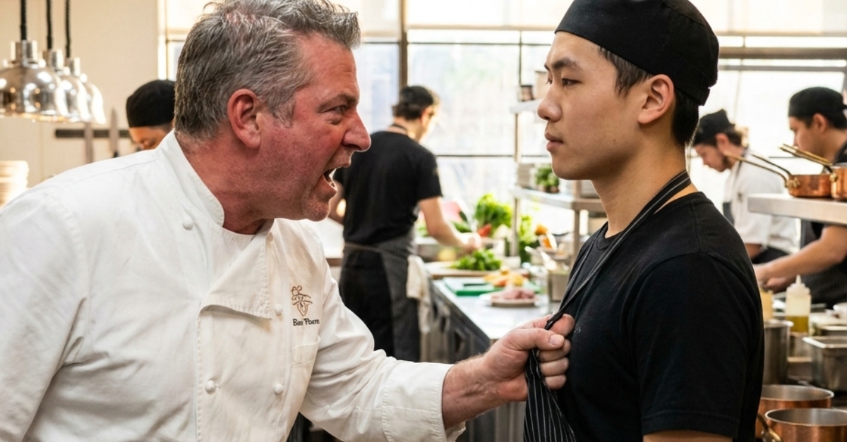 Kuhinja je bila kao visokopritisni motor od pare i čelika, ali atmosfera se pokvarila onog trenutka kada je glavni kuvar planuo. U naletu belog platna i besa, jurnuo je napred, prstima se uhvativši za rukav mladog šegrta. Naglim trzajem povukao je momka od stanice za serviranje, a silina je poslala tacnu sa delikatnim garnirima da sklizne po pločicama.