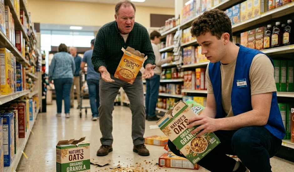 Sa smirenom odlučnošću, koja je bila u oštrom kontrastu sa čovekovom agresijom, radnik je kleknuo. Nije žurio. Podigao je jedan od palih proizvoda — čvrstu kartonsku kutiju organskog muslija — i okretao je u rukama. Nije odmah pogledao ljutitog kupca; umesto toga, usredsredio se na iscepani deo duž gornjeg zatvarača gde je grubo rukovanje nateralo karton da popusti. Radnik je konačno podigao pogled, njegov izraz je bio nečitljiv, a glas izuzetno smiren. „Ta je već otvorena,“ rekao je, klimnuvši ka kutiji koju je čovek još uvek držao u ruci.